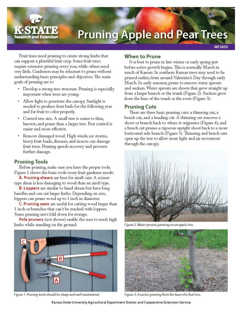 The thought of growing a fruit tree is always exciting and in Kansas there are many types of fruit trees that can be grown very successfully. What isn’t always exciting is to think about the work necessary to keep fruit trees healthy and strong. Fruit trees do require more work and regular care than shade or ornamental trees and pruning is just one key element of proper care.