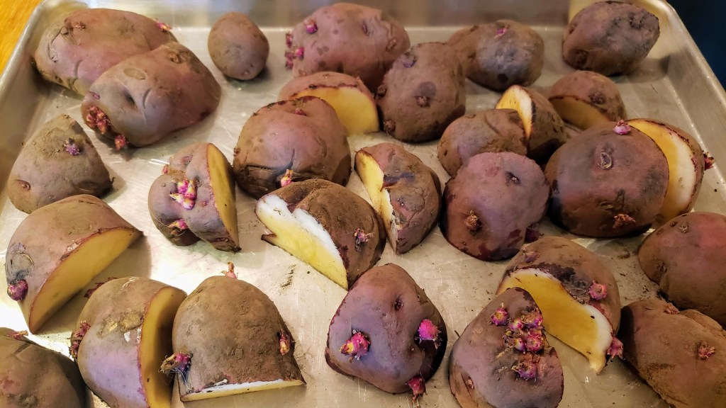 Potatoes are planted as the weather allows anytime from mid-March through early April in our area. They are planted in the garden as seed pieces cut from stored tubers (seed potatoes). Seed potatoes can be purchased at most garden stores and one pound of purchased potatoes should yield around 8-10 seed pieces. 5-6 lbs. of seed potatoes will provide seed pieces for a 50 foot row. Generally the seed potato should be cut into 1.5 to 2 ounce pieces. An average sized potato is usually cut into four pieces, but a large potato may yield up to 6 seeds pieces. Be sure to have at least one or two ‘eyes’ on each seed piece.
