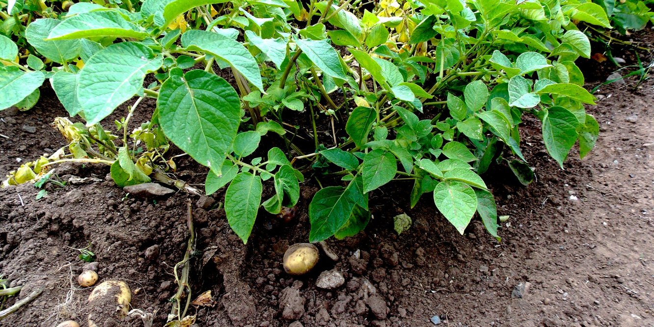 Harvesting potatoes is the fun part. Smaller early potatoes may be harvested if desired as the plants are growing by gently removing some plants in the row. Otherwise harvest the potatoes later in the summer when the vines are about half dead. Harvested potatoes need to cure and this can be done by allowing them to surface-dry in a protected area out of the sunlight for a day or two to toughen up the skin. Potatoes can then be moved into a cool, dark location for storage. It is always best to use any small or injured potatoes quickly as they do not store well.