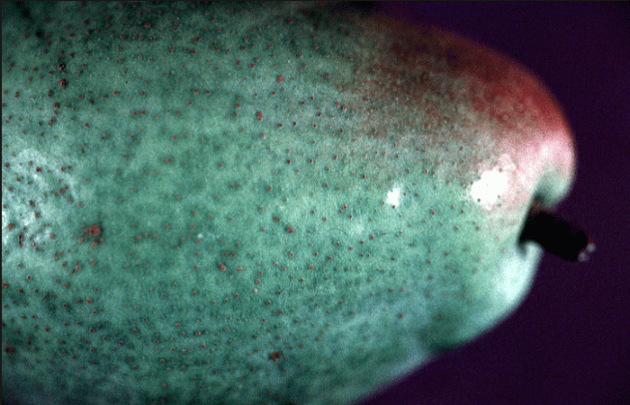 - Corking over the lenticels, the fruit’s breathing pores. Initially, they are white to greenish white, but turn brown as the fruit nears maturity. Lenticels look like brown specks on the fruit when it is ripe.