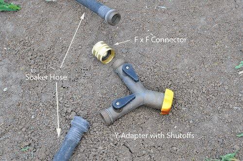 A perforated soaker hose is a good way to water a newly established bed or foundation plantings. However, soaker hoses are notorious for non-uniform watering which means you often receive too much water from one part of the hose and not enough from another. In order to solve this problem you can hook both the beginning and the end of the soaker hose to a Y-adapter which helps equalize the pressure which will provide a more uniform watering. The specific parts you need are shown in the photo and include the soaker hose, Y-adapter and female to female connector. It is also helpful if the Y-adapter has shut off valves so the volume of flow can be controlled. Too high a flow rate can allow water to run off rather than soak in.