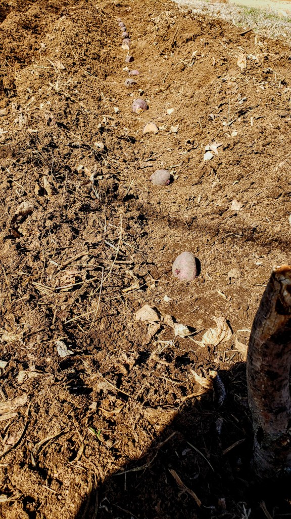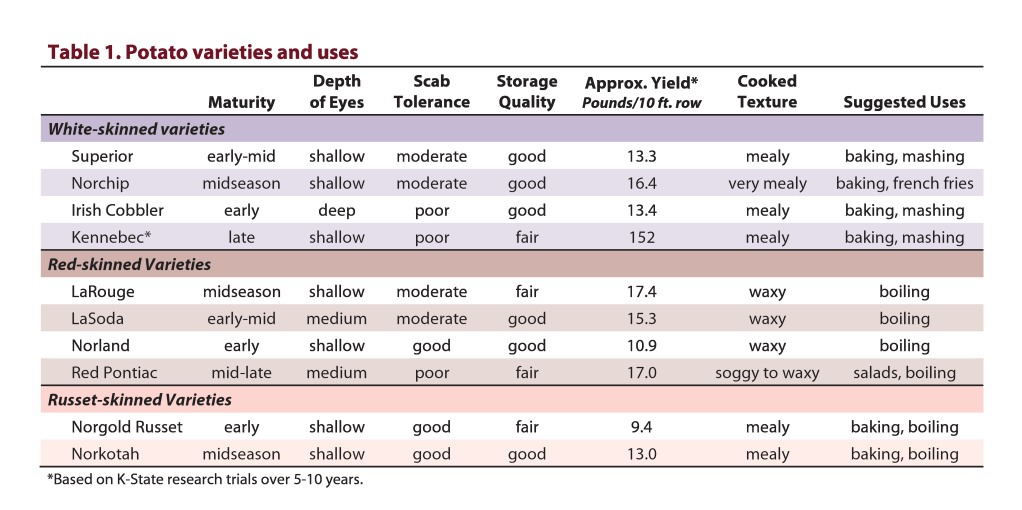 Potatoes are planted as the weather allows anytime from mid-March through early April here in Central Kansas. They are planted in the garden as seed pieces cut from stored tubers (seed potatoes). Seed potatoes can be purchased at most garden stores and one pound of purchased potatoes should yield around 8-10 seed pieces. 5-6 lbs. of seed potatoes will provide seed pieces for a 50 foot row. Generally the seed potato should be cut into 1.5 to 2 ounce pieces. An average sized potato is usually cut into four pieces, but a large potato may yield up to 6 seeds pieces. Be sure to have at least one or two ‘eyes’ on each seed piece.