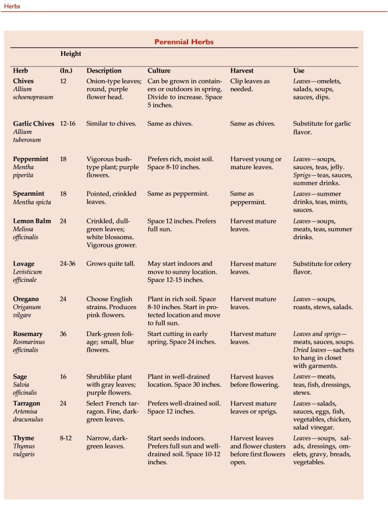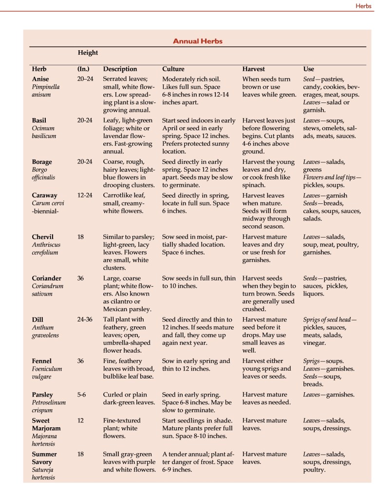 Many herbs have ornamental value, so don’t be afraid to place them in flower beds, borders, rock gardens or anywhere in the landscape. Herbs are either annual (lasting one year only) or perennial (returning year after year). This publication from the University of Missouri has a nice list of herbs and their characteristics.
