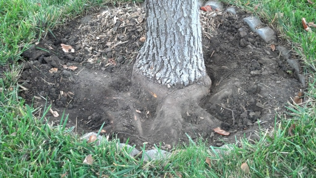 This 10 year old oak is starting to decline due to the effects of stem girdling roots that were not dealt with at planting time. This is a frustrating situation that can be avoided.