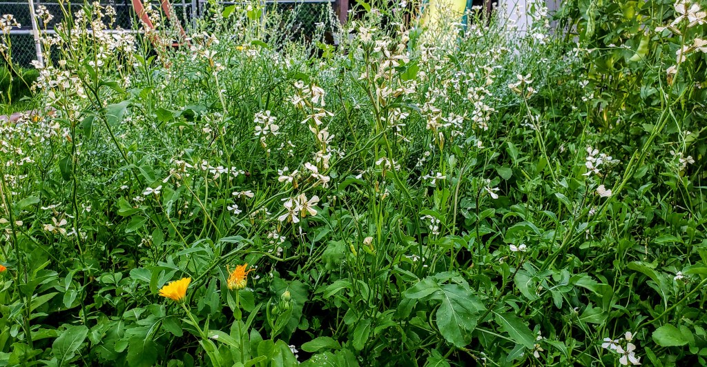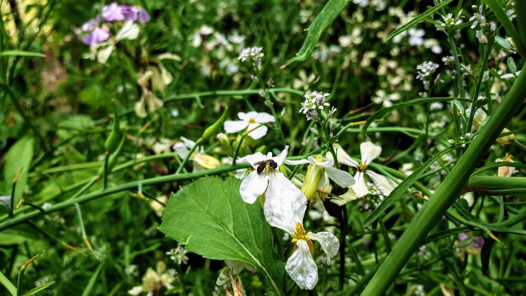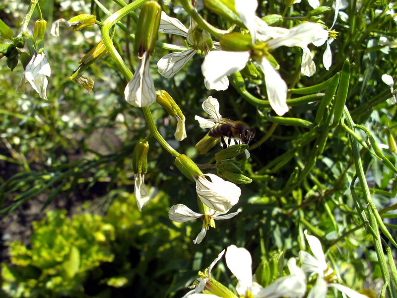 As the temperatures heat up, arugula will naturally bolt and begin flowering and setting seed. The leaves aren’t quite as tasty to eat at this time, but the arugula flowers are known to be a good resource for a number of pollinators. The research below documented the benefit of arugula flowers to pollinators.