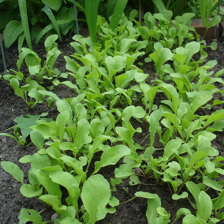 It is ok if the planting is dense since the plants can be used in a cut-and-come-again fashion. It takes 5 to 6 weeks for arugula to reach harvest size. Leaves can be harvested as soon as they are a couple inches long by carefully cutting them at the base. Harvest leaves a few at a time to allow the plant to continue producing new leaves from the main stalk. The tender young leaves have a spicy and pungent flavor often described as tangy, peppery, or mustard like.