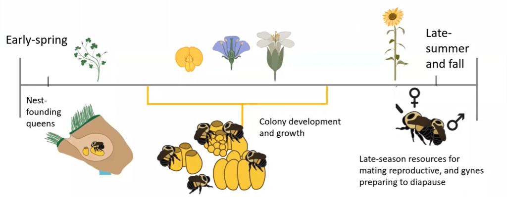 Late season flowers are critical for allowing the new bumble bee queen to build up her fat stores for overwintering and early season flowers are critical to her ability to nourish a new colony. In spring, the overwintering queen must not only feed herself, but collect enough pollen and nectar to nourish the first batch of developing offspring. This requires flowers.