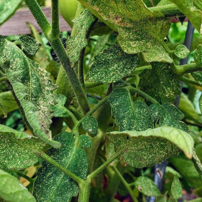 Spider mites favor hot dry summer conditions and reproduce vigorously. Mites are small in size, but the cumulation of many mites results in rapid deterioration of tomato plants. Leaf damage from mites can look like tiny, white or yellow spots, which gives the leaves a mottled appearance. More severe damage can result in bronze/brown leaves that may also drop off.