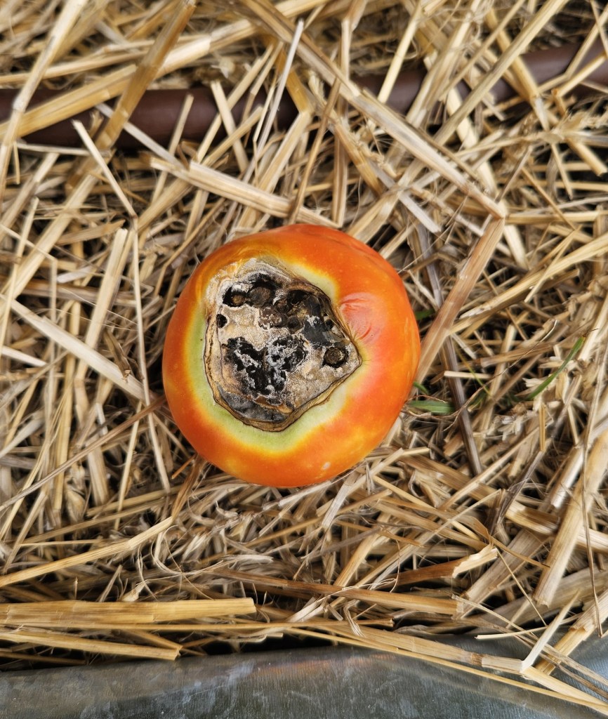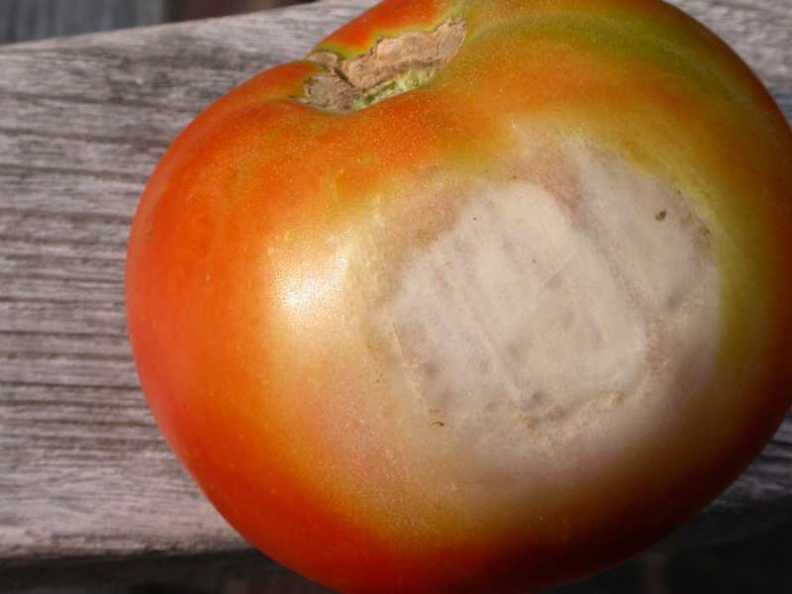 Sun scald occurs when the fruit is exposed to too much sunlight and high temperatures. This is common in tomato plants that lost leaves due to insects or disease, which allows the fruit to be exposed to direct sunlight. White or yellow spots will appear on developing fruit. The area may become a flattened grey to white spot with a paper-like texture.