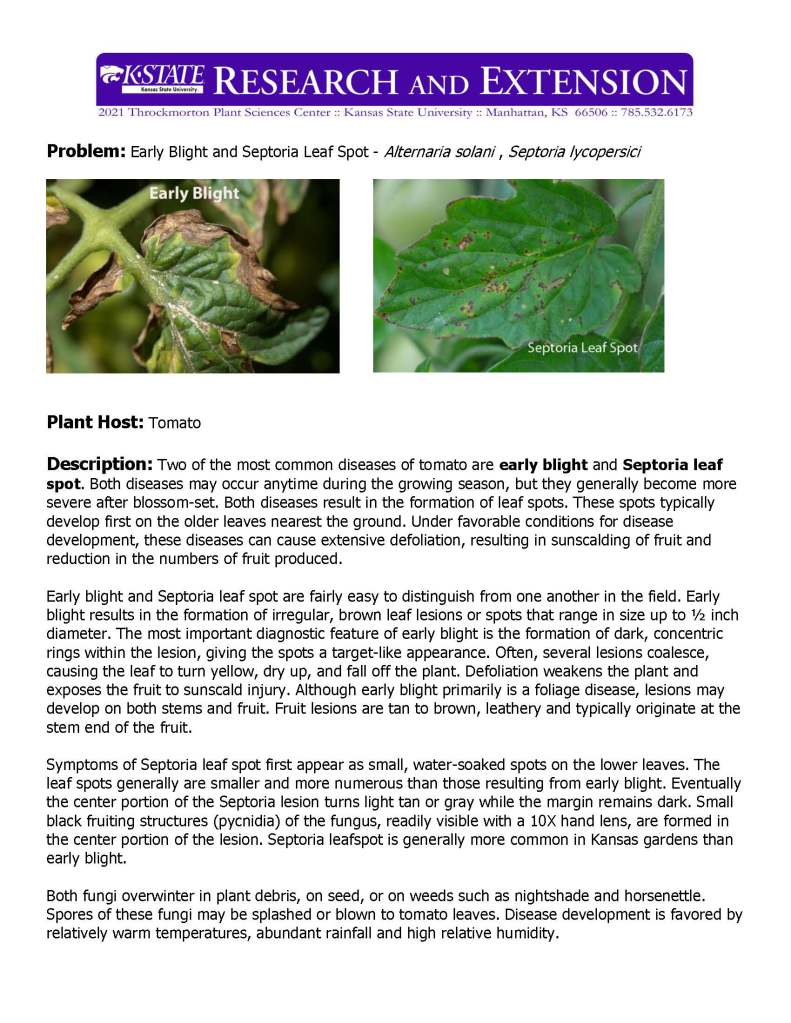 Two of the most common diseases of tomato are early blight and Septoria leaf spot. Both diseases may occur anytime during the growing season, but they generally become more severe after blossom-set. Both diseases result in the formation of leaf spots. These spots typically develop first on the older leaves nearest the ground. Under favorable conditions for disease development, these diseases can cause extensive defoliation, resulting in sunscalding of fruit and reduction in the numbers of fruit produced.