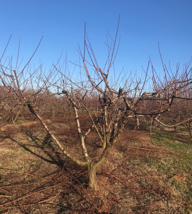 Peach trees differ from apples in that they are trained with an ‘open center’. This means they will not have a central leader, but instead 3 to 5 scaffold branches coming out from wide angles at the trunk. Peach trees require more pruning that any other fruit tree since they produce fruit only on the new wood grown the previous season. This means plenty of new wood must be grown each year for next year’s crop. If peach tree pruning is neglected, the tree will produce fruit farther and farther out from the main trunk each year, and the risk of tree breakage gets very high.