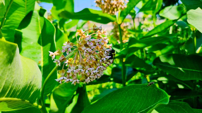 Common, butterfly, swamp, green milkweed, and other native species bloom June–August and attract an exceptional diversity of pollinators.