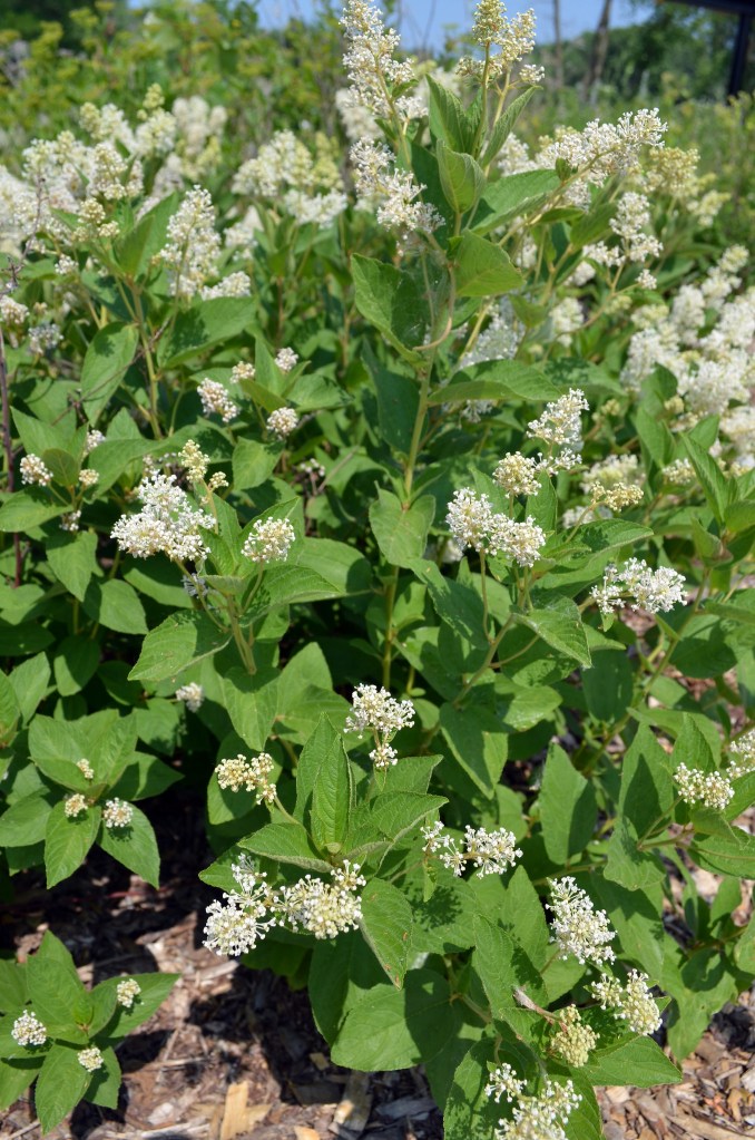 A compact native shrub blooming in June and July with fragrant white flowers. Ideal along garden edges and highly attractive to native bees and butterflies.