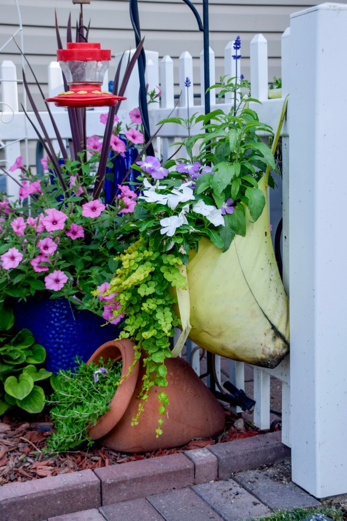 Don’t be afraid to try something new. I put flowers in a canvas bag and hung the bag on the fence. It is still a favorite!